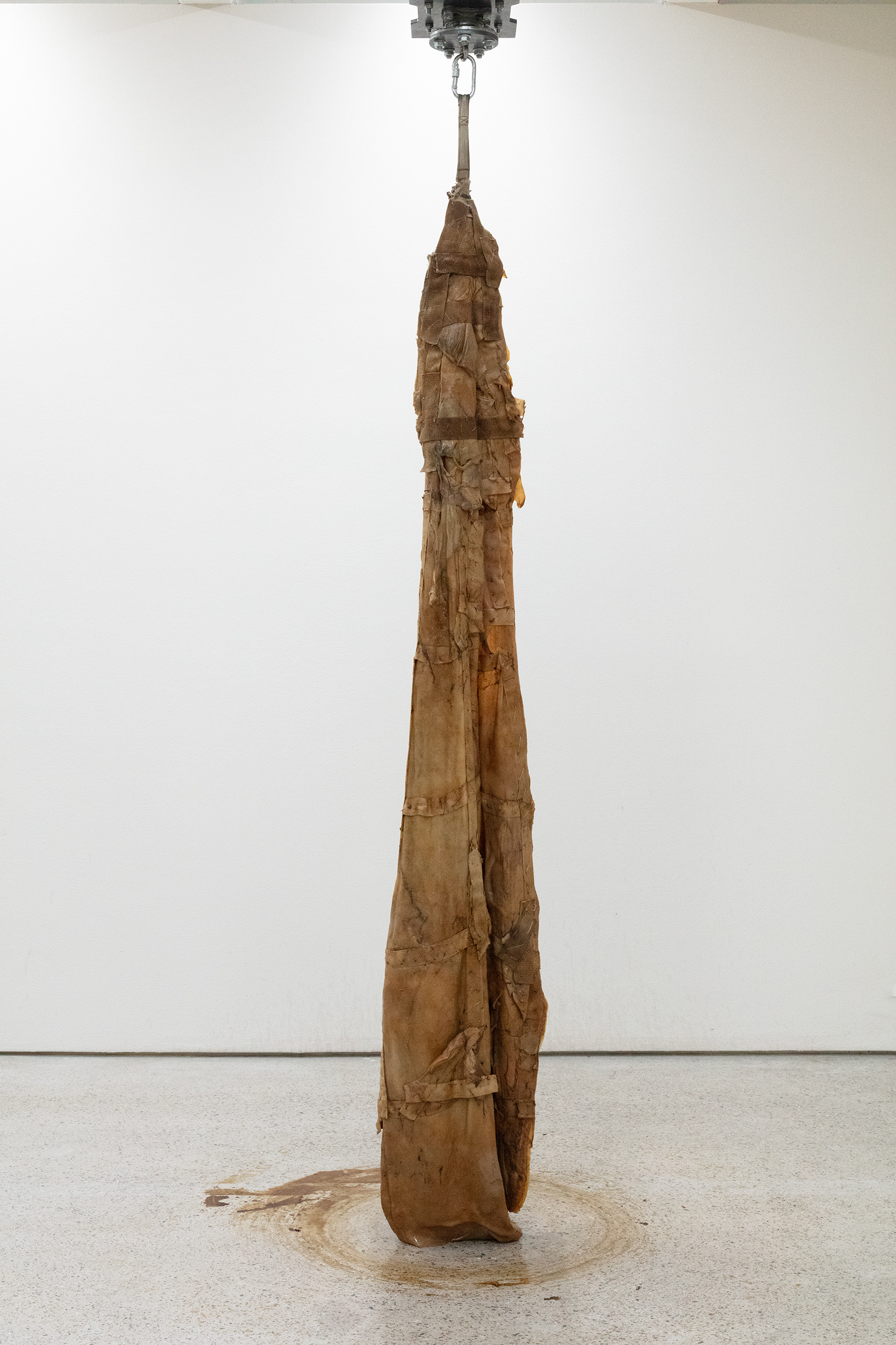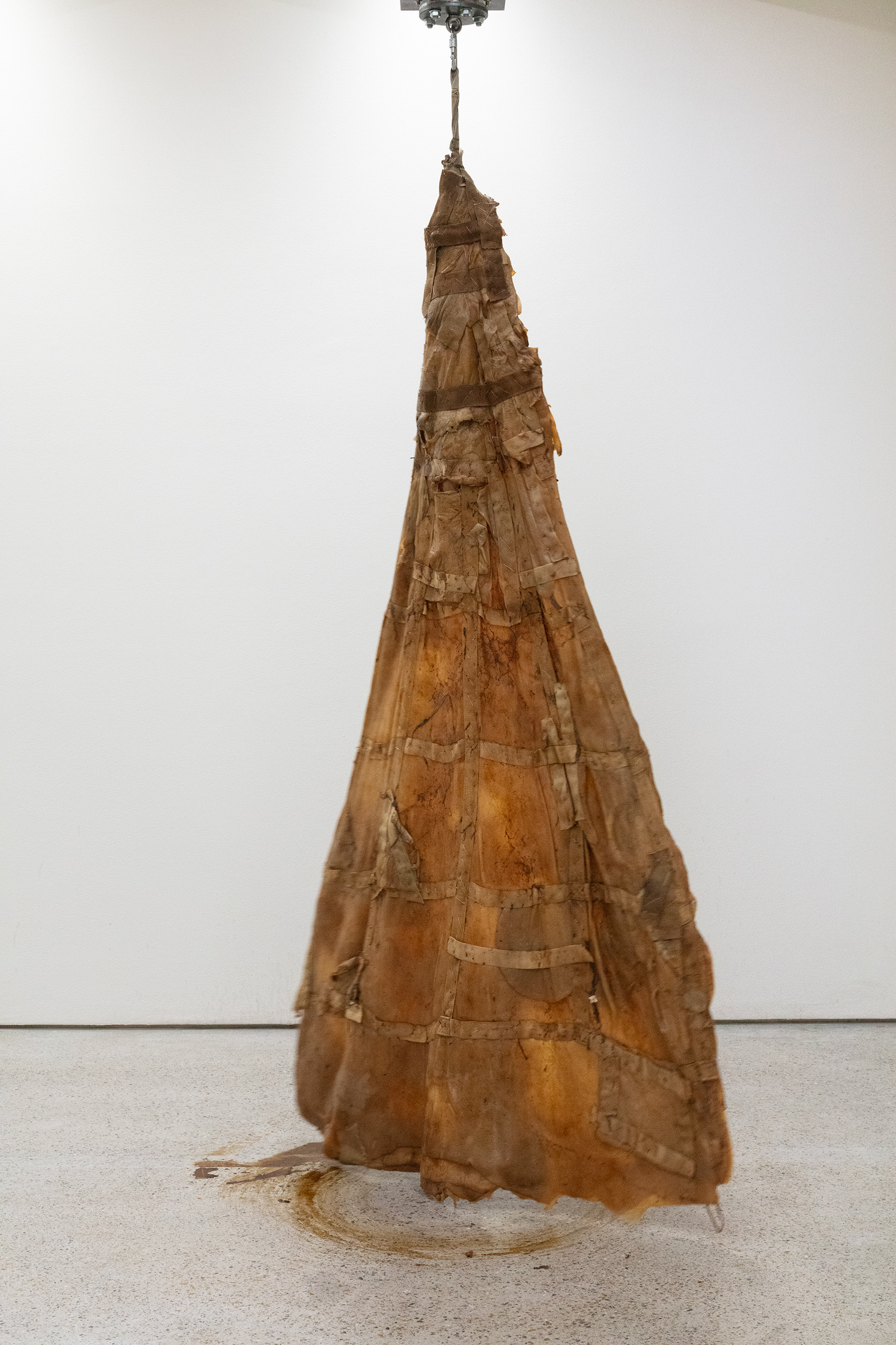 Mute Track is an installation featuring kinetic SCOBYs (Symbiotic Culture Of Bacterial Yeast), which grew over several months. They weigh between 30 and 110 kilograms and are shaped like triangles, approximately 180 cm long and 120 cm at their widest point. The SCOBYs are sewn to a webbing structure that is attached to a rotating motor and supported by a metal structure. The exhibition consists of a simple choreography. Beginning from a resting position, the motor gradually increases in speed. This takes the SCOBY from a slow circling motion into a faster rotation, stretching its fleshy form. At around 8 miles per hour, the triangular SCOBY appears to flip from front to back. After stopping, the action begins again.